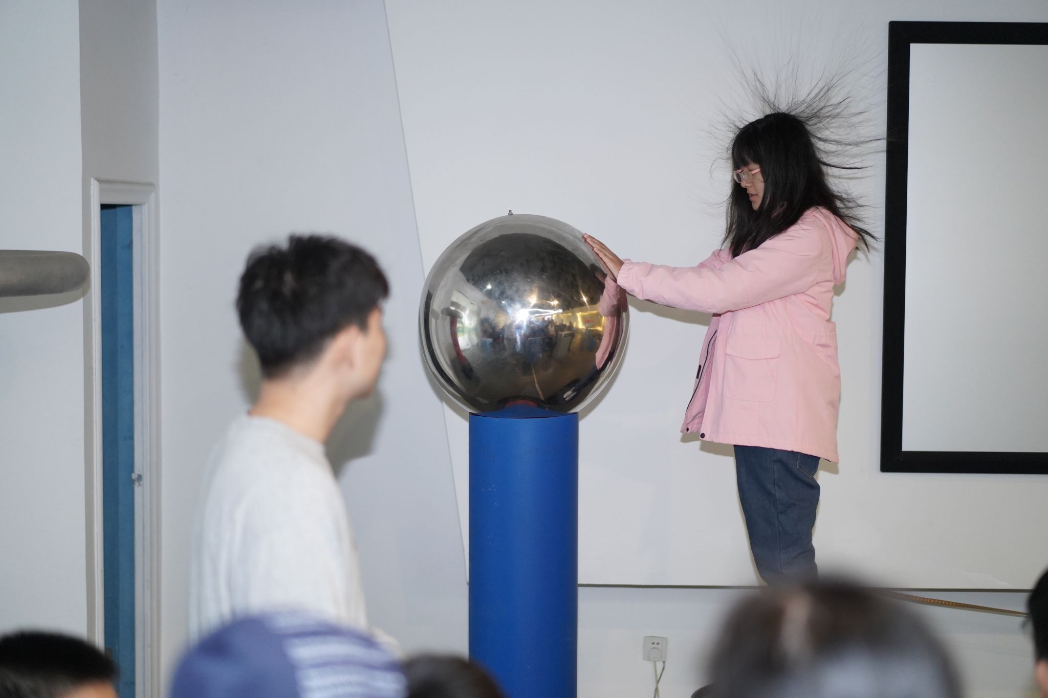 体验者在高压静电作用下“怒发冲冠”(沙区科技局供图)