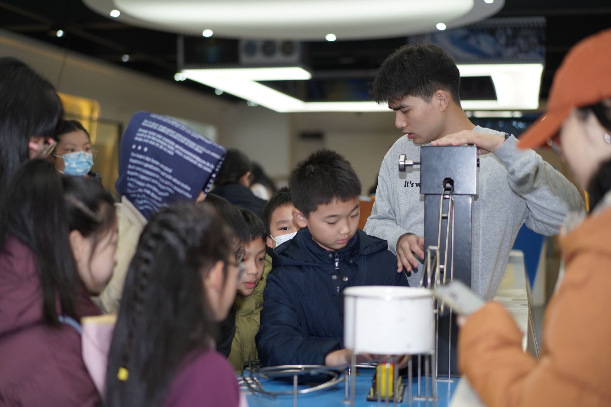 当日,重庆大学物理探索科技馆面向青少年们开放,成为科学探索的活力课堂。馆内,一系列设计精巧的互动展品牢牢吸引了他们的目光。在“静电感应”展台,体验者在高压静电作用下“怒发冲冠”,直观感受电场的存在;步入“法拉第笼”,亲历外部数十万伏高压放电而内部安然无恙的奇妙现象,电磁屏蔽原理不言自明;而“磁阻尼摆”、“角动量守恒演示仪”等经典装置,则将抽象的物理定律转化为可视、可感的动态过程。学生们在动手操作和观察中不断发出惊叹,并提出各种问题,现场气氛热烈。